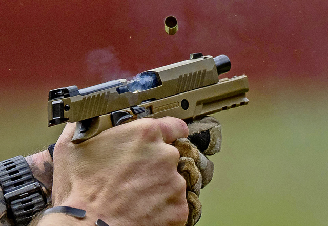 U.S. Air Force Tech. Sgt. Tyler Karr, 435th Contingency Response Group flight chief, fires a M18 pistol during an advanced rifle and pistol event for the U.S. Air Forces in Europe – Air Forces Africa Defender Challenge Selection at the Breitenwald Training Area, Landstuhl, July 31. Karr had to run from different points in a gun range, shoot targets, and practice safety as fast as he could during the advanced rifle and pistol event. The DCS gave a chance to test defenders within Europe on individual combat and fire team combat with the winners competing at the Air Force level challenge at Fort Bliss, Texas.