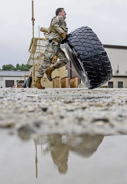 U.S. Air Force Senior Airman Michael Siedentopf, 701st Munitions Support Squadron area supervisor, from Kleine Brogel Air Base, Belgium, flips a tire for the combat fitness test portion of the U.S. Air Forces in Europe – Air Forces Africa Defender Challenge Selection at Ramstein Air Base, Aug. 2. The combat fitness test pushed participants physically and mentally while they competed in the rain.