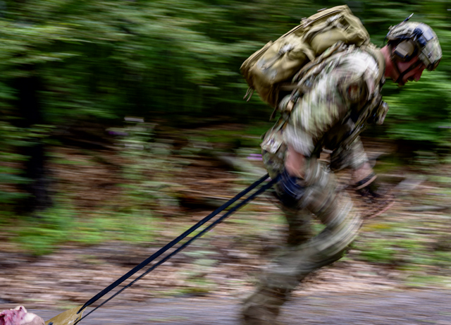 U.S. Air Forces in Europe – Air Forces Africa security forces military personnel walk to a pre-brief for the USAFE Defender Challenge Selection at the Breitenwald Training Area, Landstuhl, July 31. The pre-brief provided more information for the next challenge, an advanced rifle and pistol event.