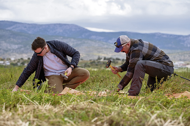 U.S. Air Force 2nd Lt. Jordan Von Seggern, a member of the 86th Airlift Wing’s Cross-Functional Airlift Support Personnel (CASPER) program, and Tech. Sgt. Nicholas Coburn, 86th Airlift Wing Agile Combat Employment Mission Ready Airmen program manager, stake down drop zone markers during exercise Stolen Cerberus XII at the Megara Drop Zone, Greece, April 30, 2025,. CASPER Airmen had the opportunity to exercise their newly learned skill sets in a real-world scenario. (U.S. Air Force photo by Senior Airman Brenden Beezley)