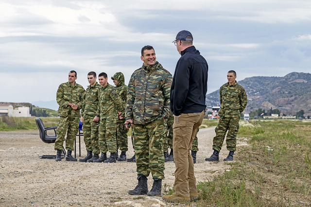 U.S. Air Force Capt. Eric Zielen-Ersing, 37th Airlift Squadron Stolen Cerberus mission commander, greets Hellenic Air Force Maj. Gen. Vasileios Broumas, Hellenic Air Force Support Command commander, during exercise Stolen Cerberus XII at Elefsina Air Base, Greece, May 2, 2025. During the day, Hellenic Air Force distinguished visitors received a C-130J brief and a mission showcase. (U.S. Air Force photo by Senior Airman Brenden Beezley)