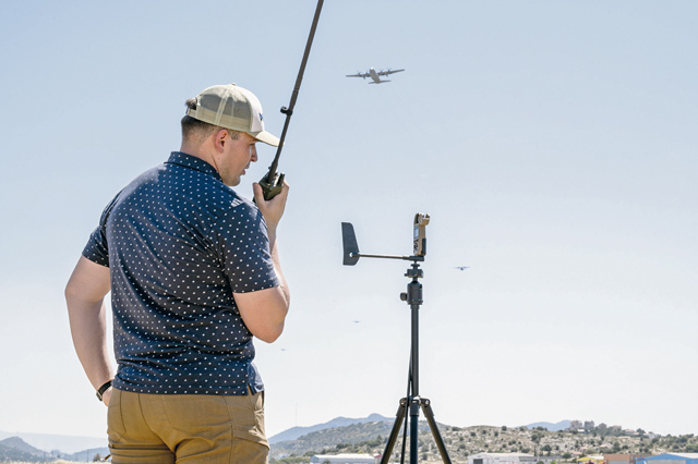 U.S. Air Force 2nd Lt. Jordan Von Seggern, a member of the 86th Airlift Wing’s Cross-Functional Airlift Support Personnel (CASPER) program, communicates via radio with a Hellenic Air Force C-130H Hercules during exercise Stolen Cerberus XII at the Megara Drop Zone, Greece, May 3, 2025. Stolen Cerberus improved overall coordination with the Hellenic Air Force assuring the U.S. is committed to increasing the capability, readiness and responsiveness of allied forces. (U.S. Air Force photo by Senior Airman Brenden Beezley)
