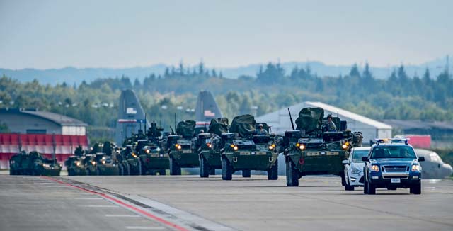 Stryker infantry carrier vehicles convoy across Ramstein’s flightline