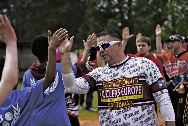 U.S. Army Chief Warrant Officer Patrick Waltman, European Guzzlers softball player, high fives students after the Adaptive Sports softball game at Donnelly Park May 4 on Ramstein. As part of tradition, opposing teams will slap hands and exchange the words “good game” to show respect and good sportsmanship.