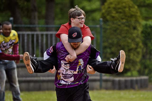 Nick Waller, European Guzzlers softball player, carries James Lucas, Kaiserslautern Middle School student, while running to second base during the Adaptive Sports softball game at Donnelly Park May 4 on Ramstein. The Guzzlers helped the special-needs students during the game as part of the Adaptive Sports program.