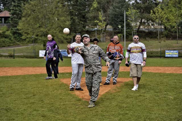 Chief Master Sgt. Aaron D. Bennett, 86th Airlift Wing command chief, throws the first pitch during the Adaptive Sports softball game at Donnelly Park May 4 on Ramstein. Special-needs students faced each other in the game to build friendships and morale.
