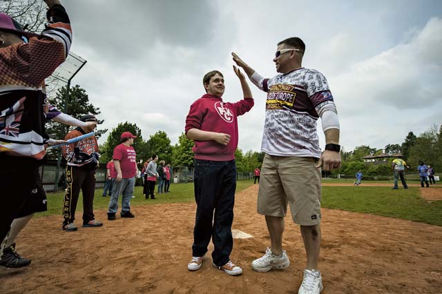 Matthew Thompson, Ramstein High School student, gives U.S. Army Chief Warrant Officer Patrick Waltman, European Guzzlers softball player, a high five during the Adaptive Sports softball game at Donnelly Park May 4 on Ramstein. The Guzzlers came out to the event to support and cheer on the special-needs students.