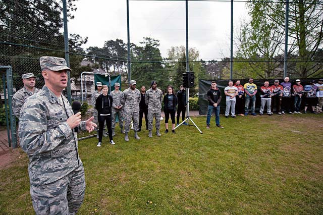 Col. Brandon Hileman, 86th Airlift Wing vice commander, gives a speech to commence the Adaptive Sports softball game at Donnelly Park May 4 on Ramstein. Hileman spoke about the impact the Adaptive Sports events have on the students by building camaraderie and friendships.