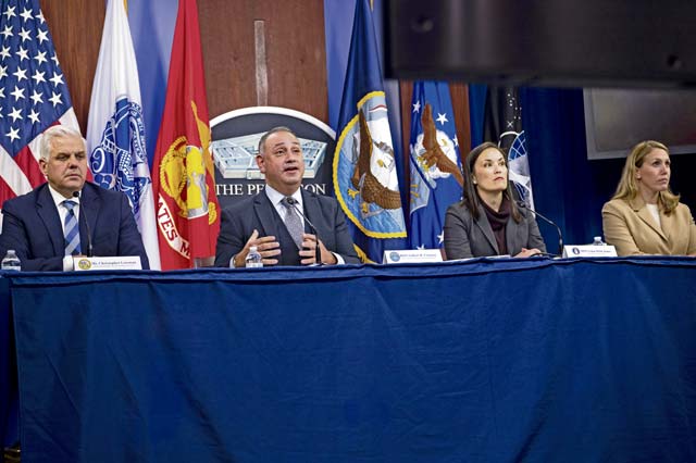 Under Secretary of Defense for Personnel and Readiness Gilbert R. Cisneros Jr. provides testimony to a workforce development hearing of the House Appropriations Defense Subcommittee, with, from left, Christopher Lowman, the senior official performing the duties of Under Secretary of the Army; Under Secretary of the Air Force Gina Ortiz Jones; and Meredith A. Berger, the senior official performing the duties of Under Secretary of the Navy, at the Pentagon, Washington, D.C., Oct. 26. Photo by Lisa Ferdinando