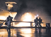 Firefighters and base leadership demonstrate extinguishing an aircraft fire Oct. 8 on Ramstein. As part of Fire Prevention Week, families visited Fire Station 1 to learn about fire safety including home-fire safety issues, fire extinguisher training and holiday safety tips. The event concluded with a live fire demonstration where leadership from throughout Ramstein helped firefighters extinguish a simulated aircraft fire in the burn pit.