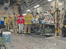 Firefighters and medical personnel standby to assist in the transport of a patient during an aeromedical evacuation mission Aug. 9 on Ramstein. The personnel assisting in the mission were from the 86th Civil Engineer Squadron KMC Fire Emergency Services, the 10th Aeromedical Evacuation Operations Team and the 455th Critical Care Air Transport Team.