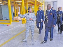 Tech. Sgt. Stephanie Brown, 86th Logistics Readiness Squadron aircraft parts store NCOIC, briefs members of the Ghanaian air force during a tour Aug. 18 on Ramstein.