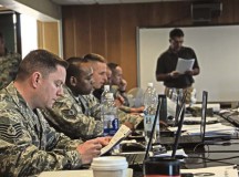 Airmen look at their course handouts as Michael DeJacomo, a mobile training team instructor with the 312th Training Squadron, conducts a lecture during a Fire Officer III certification course May 13 on Ramstein. Eighteen firefighters from across U.S. Air Forces in Europe gathered for the 10-day advanced fire protection course which began May 4.