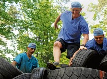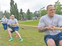 Members of team “Zombie Dentists” climb a tire wall during the Mudless Mudder event June 2 on Ramstein. Mudless Mudder was part of the 86th Airlift Wing’s Resilience Day, which gave participants the opportunity to spend time with others and build working relationships.