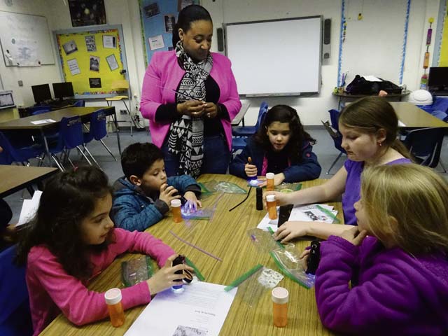 Azmeralda Poole pushes the chalk down on the ground and draws two dots inside a circle, cracking a grin as she sketches a smiling face. She points to her creation as she looks up at Nicole Flores, her Vogelweh Elementary School counselor.