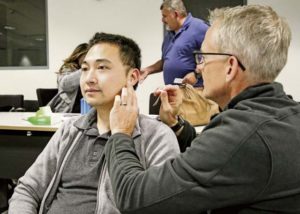 Aaron Castle, a primary care physician at Wiesbaden Army Health Clinic, practices acupuncture as a form of pain management during Landstuhl Regional Medical Center’s Traumatic Brain Injury and Rehabilitation Clinic’s TBI Champion Training Conference, at Ramstein Air Base, Sept. 6. The three-day conference assembled medical professionals across Europe and Western Asia to promote standardization of TBI clinical care by sharing knowledge, current recommendations and best practices.