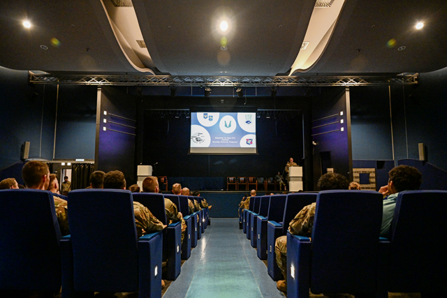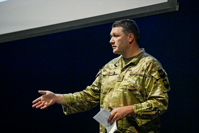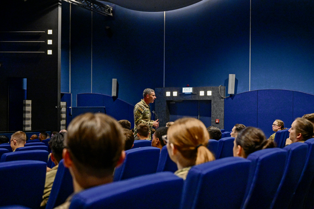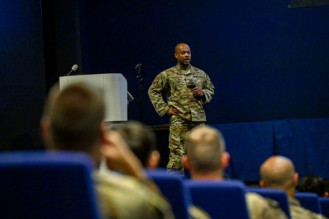 Master Sgt. Marvin Richardson, a U.S. Air Forces in Europe – Air Forces Africa A4RX command logistics operations manager, gives a mission brief at the 2025 Ramstein 2T2 Summit at the Hercules Theater on Ramstein Air Base, Germany, Aug. 28, 2025. The 2T2 Summit is a professional development seminar for aerial transportation airmen located around Ramstein to learn about the various opportunities the career field holds, hear stories from guest speakers, and network with other fellow aerial transportation airmen. Aerial Transportation Airmen are commonly referred to as Port Dawgs, or 2T2’s to reflect the first three characters of their Air Force Specialty Code. (U.S. Air Force photo by Staff Sgt. Joshua T. Crossman)