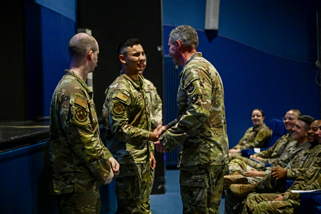 Chief Master Sgt. Timothy Okkerse, 721st Air Mobility Operations Group senior enlisted leader, coins the Airmen who were responsible for putting together the inaugural Ramstein 2T2 Summit at the Hercules Theater on Ramstein Air Base, Germany, Aug. 28, 2025. The 2T2 Summit is a professional development seminar for aerial transportation airmen located around Ramstein to learn about the various opportunities the career field holds, hear stories from guest speakers, and network with other fellow aerial transportation airmen. Aerial Transportation Airmen are commonly referred to as Port Dawgs, or 2T2’s to reflect the first three characters of their Air Force Specialty Code. (U.S. Air Force photo by Staff Sgt. Joshua T. Crossman)