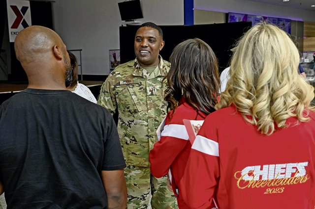 Members of the Kansas City Chiefs, including retired Chief’s player Dante Hall, two cheerleaders, and the mascot, visit service members at the Kaiserslautern Military Community Center at Ramstein Air Base, Germany, May 29, 2023.