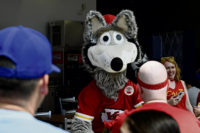 The mascot for the Kansas City Chiefs, KC Wolf, interacts with members of the Kaiserslautern Military Community during a meet and greet at Ramstein Air Base, Germany, May 29, 2023. KC Wolf has been the mascot for the Kansas City Chiefs since 1989 and often attends community events. Service members from multiple services and installations and their families throughout the KMC attended the event. (U.S. Air Force photo by Tech. Sgt. Rose Gudex)