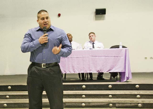Cesar Alvarez, 86th Medical Operations Squadron Health Promotion coordinator, addresses the impact of domestic abuse on children during the Speak Out Against Domestic Violence event Oct. 8 on Ramstein. Alvarez was one of four members on an all-male panel to focus on domestic violence against women. Though men are also abused, the Department of Justice reports that more male offenders are reported than female.