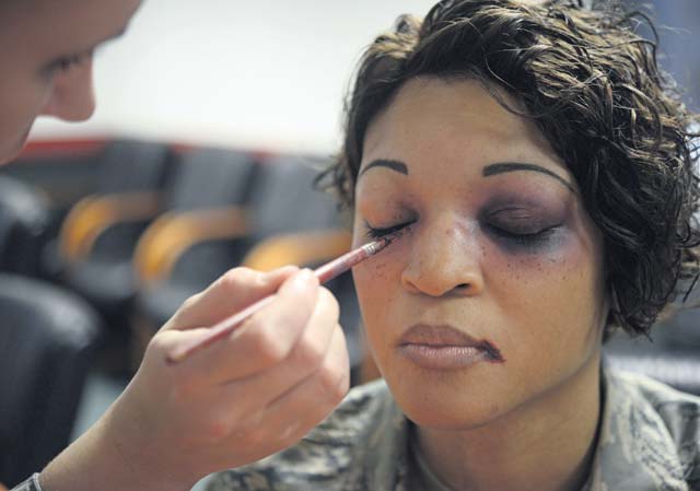 Photo by Senior Airman Timothy Moore Senior Airman Liberty Provo, 86th Dental Squadron dental laboratory technician, applies makeup to Tech. Sgt. Erica Carr, 86th Communications Squadron KMC frequency manager, to simulate domestic violence injuries Oct. 2 on Ramstein. October is Domestic Violence Awareness Month, and this year’s theme is “Thanks for Asking.” Participants volunteered to don the fake injuries to raise awareness for domestic violence victims who sometimes remain silent.