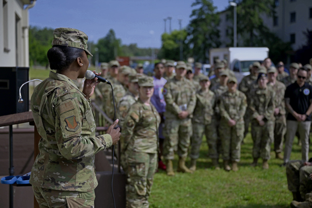 U.S. Air Force Chief Master Sgt. Charmaine Kelly, 86th Airlift Wing command chief, speaks to a crowd at Ramstein Air Base, June 2. The newly-opened Den features many facilities for Airmen to utilize, such as a game room, music room, and multiple rooms for relaxing.