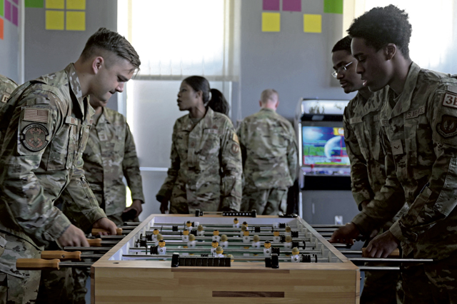 U.S. Air Force Airmen compete in a game of table football at Ramstein Air Base, June 2. The game room at The Den features different types of games, from modern consoles to board games.
