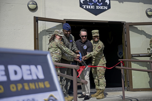 U.S. Air Force Lt. Col. Alison Freiman, 86th Civil Engineering Squadron commander, left, U.S. Air Force Brig. Gen. Otis C. Jones, 86th Airlift Wing commander, middle left, U.S. Air Force Staff Sgt. James Frick II, 86th Force Support Squadron Airman Leadership School instructor, middle right, and U.S. Air Force Chief Master Sgt. Charmaine Kelly, 86th Airlift Wing command chief, right, cut the ribbon at The Den grand opening at Ramstein Air Base, June 2. The newly-opened Den aims to provide a space for Airmen to be creative as well as develop their skills.