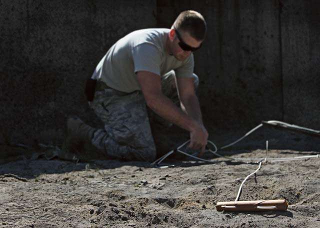 Airman 1st Class Htyler Kelley, 886th Civil Engineer Squadron explosive ordnance disposal technician, places explosives during training June 26.