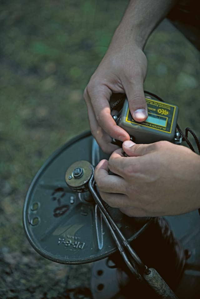 Airman 1st Class Tyler Hatfield, 886th Civil Engineer Squadron explosive ordnance disposal technician, checks the current of a trigger used to detonate explosives during training June 26 on Ramstein. Ramstein EOD Airmen provide support to three wings, 26 geographically separated units and two U.S. Army brigades.