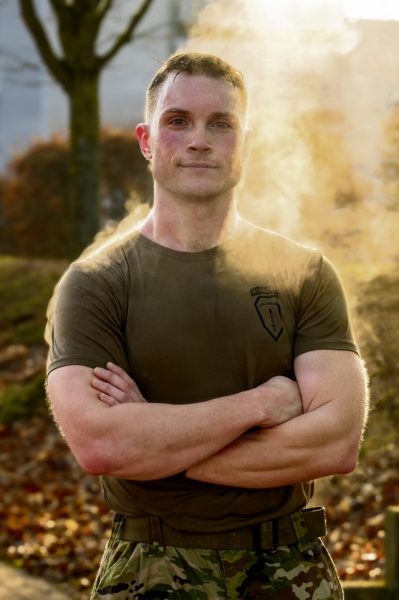 U.S. Army Sgt. Michael Glosemeyer, 7453rd Medical Operations Readiness Unit Deployed Warrior Medical Management Center clinic noncommissioned officer, cools off after successfully completing the 2026 Norwegian Foot March on Ramstein Air Base, Germany, March 7, 2026. Glosemeyer was the first participant to complete the event in 2 hours, 59 minutes and 20 seconds. (U.S. Air Force photo by Tech. Sgt. Cynthia Belío)