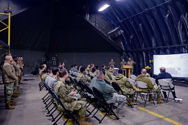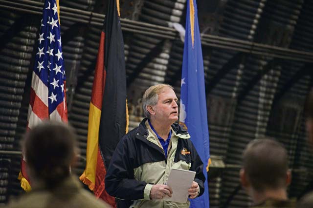 Jerry Brooks, Air Staff Eagle Vision One Project Office director, speaks to Airmen from the 24th Intelligence Squadron during a sunset ceremony at Ramstein Air Base, Jan. 28. Eagle Vision One used satellite imagery to support operations as well as aiding allies during natural disasters. Photo by Airman 1st Class Manuel Zamora