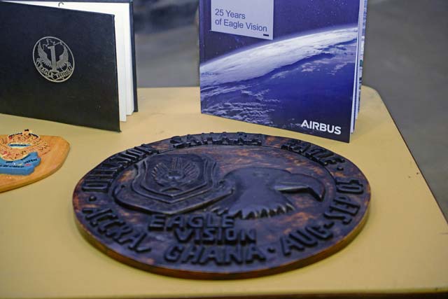 A wooden plaque, memorializing Eagle Vision One in Ghana, lays on a table during a sunset ceremony at Ramstein Air Base, Jan. 28. Eagle Vision One used satellite imagery to support operations as well as aiding allies during natural disasters. Photo by Airman 1st Class Manuel Zamora