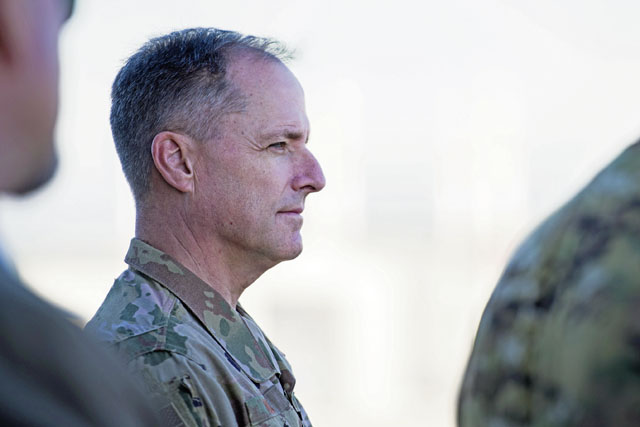 U.S. Air Force Maj. Gen. John Wood, Third Air Force commander, listens to a brief during an immersion tour of the 86th Airlift Wing at Ramstein Air Base, Oct. 5. Wood took command of the Third Air Force Sept. 7.