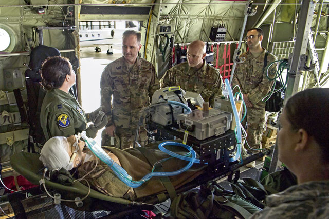 (Above left) U.S. Air Force Capt. April Oliver, 86th Medical Squadron Critical Care Air Transport Team nurse, briefs Maj. Gen. John Wood, Third Air Force commander, during a tour with the 86th Airlift Wing, at Ramstein Air Base, Oct. 5. Falling under the Third Air Force, members of the 86th further explained the successful role they play in Ramstein’s diverse mission.