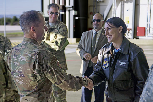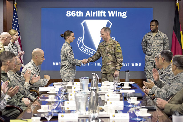U.S. Air Force Maj. Gen. John Wood, Third Air Force commander, coins Staff Sgt. Cara Holder, 86th Logistics Readiness Squadron noncommissioned officer in charge of deployment, during the a tour of the 86th Airlift Wing, at Ramstein Air Base, Oct. 5. Wood coined outstanding performers from units assigned to the 86th AW.