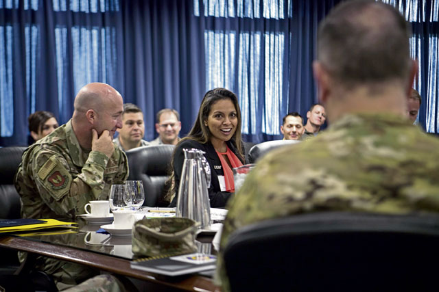 Lara Cruz Munoz, Third Air Force key spouse, asks U.S. Air Force Brig. Gen. Mark August, 86th Airlift Wing commander, a question during a tour of the 86th AW, at Ramstein Air Base, Oct. 5. Key spouses attended a separate immersion tour throughout the day.
