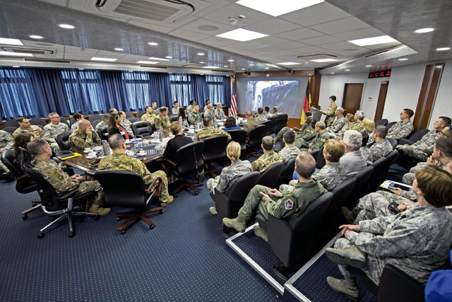 Leadership from across the 86th Airlift Wing attend a mission brief with Maj. Gen. John Wood, Third Air Force commander, and Command Chief Master Sgt. Anthony Cruz Munoz during an immersion tour of the 86th AW, at Ramstein Air Base, Oct. 5. The tour began with a mission video showing Ramstein’s diverse mission set.