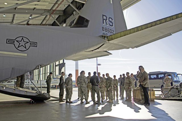 Leadership teams from the Third Air Force are briefed by members of the 86th Aeromedical Evacuation Squadron during an immersion tour of the 86th AW, at Ramstein Air Base, Oct. 5. Airmen spoke on the part their units play in Ramstein’s diverse mission.