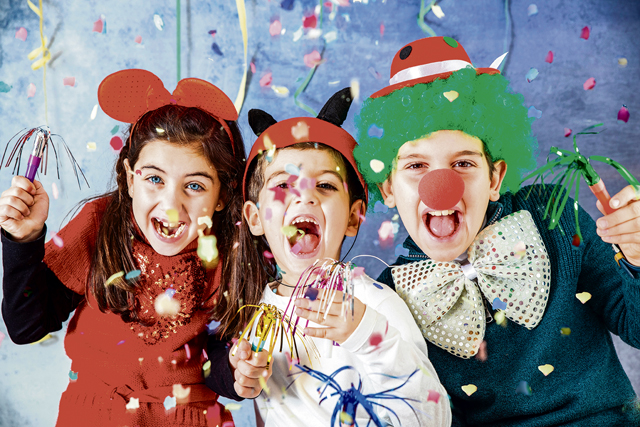 Three,Kids,Celebrating,Carnival,Together,At,Home