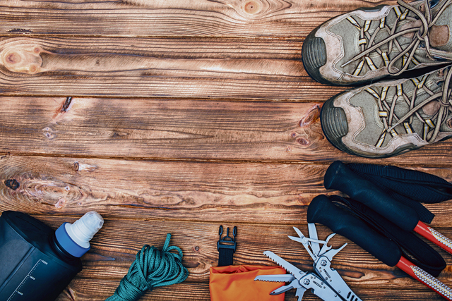 Top,View,Of,Equipment,For,Hiking,And,Travel,On,Wooden