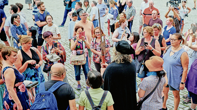 Tourists,Gather,Around,The,Famous,Night,Watchman,Of,Rothenburg,Germany