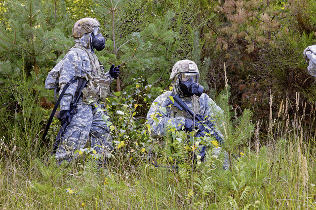 U.S. Army Sgt. 1st Class Shane Hope, an explosive ordnance disposal team leader assigned to 702nd Ordnance Company, 18th Military Police Brigade, pulls security for his team during the CBRN lane of the U.S. Army Europe and Africa Best Squad Competition at U.S. Army Garrison Bavaria, Germany, Aug. 26, 2025. The competition brings together squads from across the command to test their tactical proficiency, communication and cohesion.
