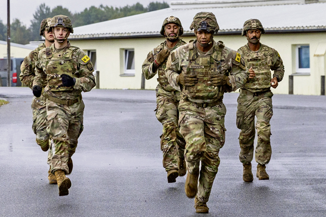 U.S. Army Soldiers assigned to 16th Sustainment Brigade, 21st Theater Sustainment Command, run during the Expert Physical Fitness Assessment as part of the U.S. Army Europe and Africa Best Squad Competition on U.S. Army Garrison Bavaria in Grafenwoehr, Germany, Aug. 27, 2025. Best Squad Competitions are opportunities for units to showcase their toughest soldiers in competition utilizing events based on physical, technical, and tactical abilities under stress and fatigue. Winners of this competition will advance to compete in the U.S. Army Best Squad Competition. (U.S. Army photo by Pfc. Kadence Connors)