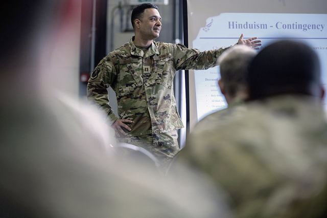 U.S. Air Force Capt. Vikas Kumar, 86th Operations Support Squadron aerospace physiologist, presents slides on Hinduism during a joint religious support team training at Ramstein Air Base Germany, April 18, 2024. This training, hosted by 86th Airlift Wing and U.S. Army Garrison – Rheinland-Pfalz chaplains, focused on enhancing chaplains’ foundational understanding on different religions and faiths, and their ability to provide inclusive care in joint and contingency environments. (U.S. Air Force photo by Senior Airman Jordan Lazaro)