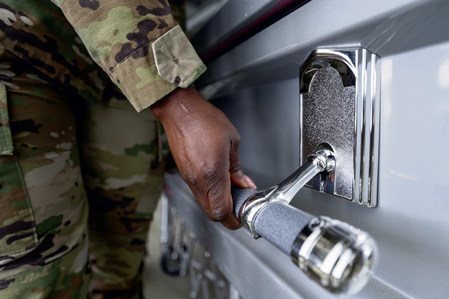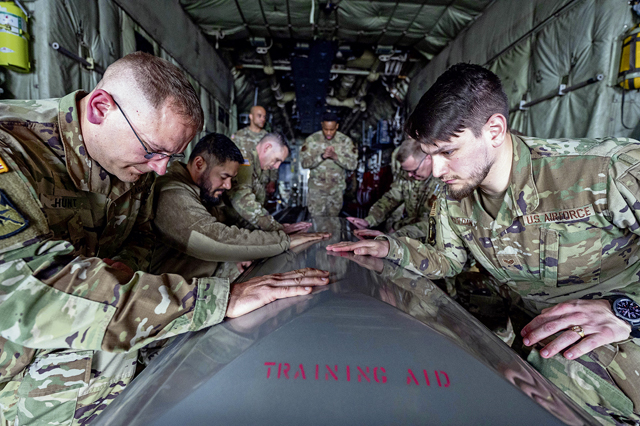 Religious support military members rest their hand on a training casket to say goodbye while a chaplain prays during a simulated ramp ceremony at Ramstein Air Base Germany, April 18, 2024. A ramp ceremony is a process by which remains of fallen military members are honorably transferred to an aircraft from a vehicle before they are airlifted home—an experience military religious professionals are often not exposed to outside of a deployment. (U.S. Air Force photo by Senior Airman Jordan Lazaro)