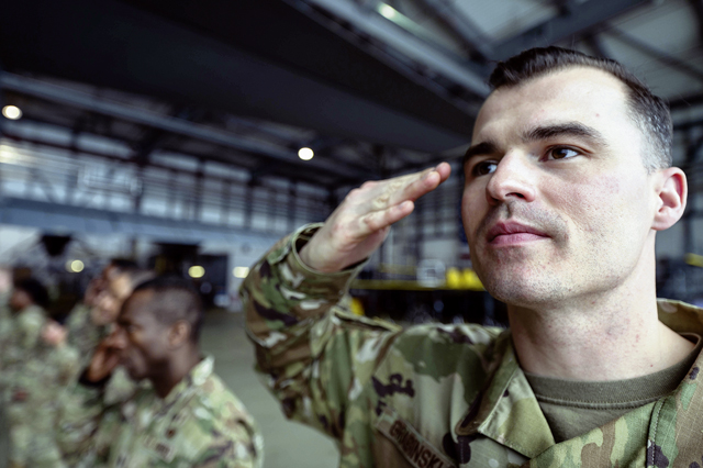U.S. Air Force Tech. Sgt. James Grabinski, 86th Airlift Wing Headquarters Chapel noncommissioned officer in charge of chapel operations, renders a salute during a ramp ceremony training event at Ramstein Air Base Germany, April 18, 2024. A ramp ceremony is a process by which remains of fallen military members are honorably transferred to an aircraft from a vehicle before they are airlifted home—an experience military religious professionals are often not exposed to outside of a deployment. (U.S. Air Force photo by Senior Airman Jordan Lazaro)