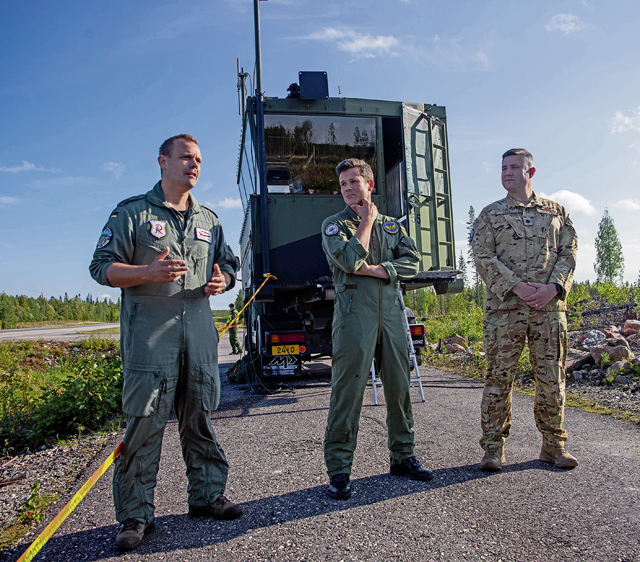 U.S. Lt. Col. David Deal, right, 435th Contingency Response Support Squadron commander, assigned to Ramstein Air Base, Germany stands with Finnish air force Col. Saku Joukas, middle, Lapland Air Wing commander, Finland and German air force Lt. Col. Thomas Kotting, left, Tactical Air Wing 71R commander assigned to Wittmund Air Base at a press conference during exercise BAANA 2024 on Hosio Highway strip, Ranua, Finland, Sept. 4. During the exercise U.S. Air Force Airmen expanded on Agile Combat Employment capabilities by learning austere environment aircraft landing and take-off operations and techniques from their Finnish counterparts. (U.S. Air Force photo by Airman 1st Class Tabatha Chapman)