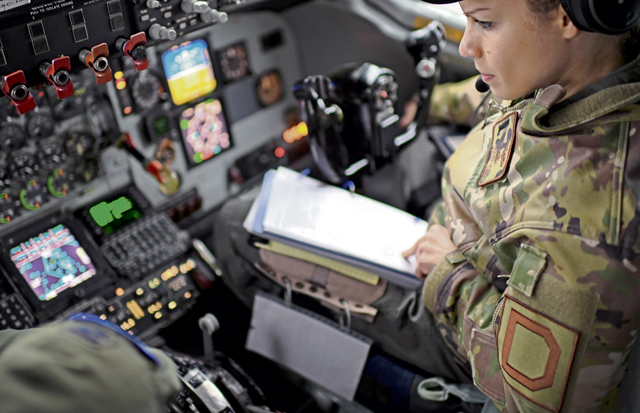 U.S. Air Force 1st Lt. Mckall Hyde, 351st Air Refueling Squadron pilot, prepares a KC-135 Stratotanker aircraft for a flight supporting a flyover above Latvia, May 4. The 100th Air Refueling Wing’s KC-135s are a force multiplier that extend the reach of fighter, bomber and cargo aircraft.